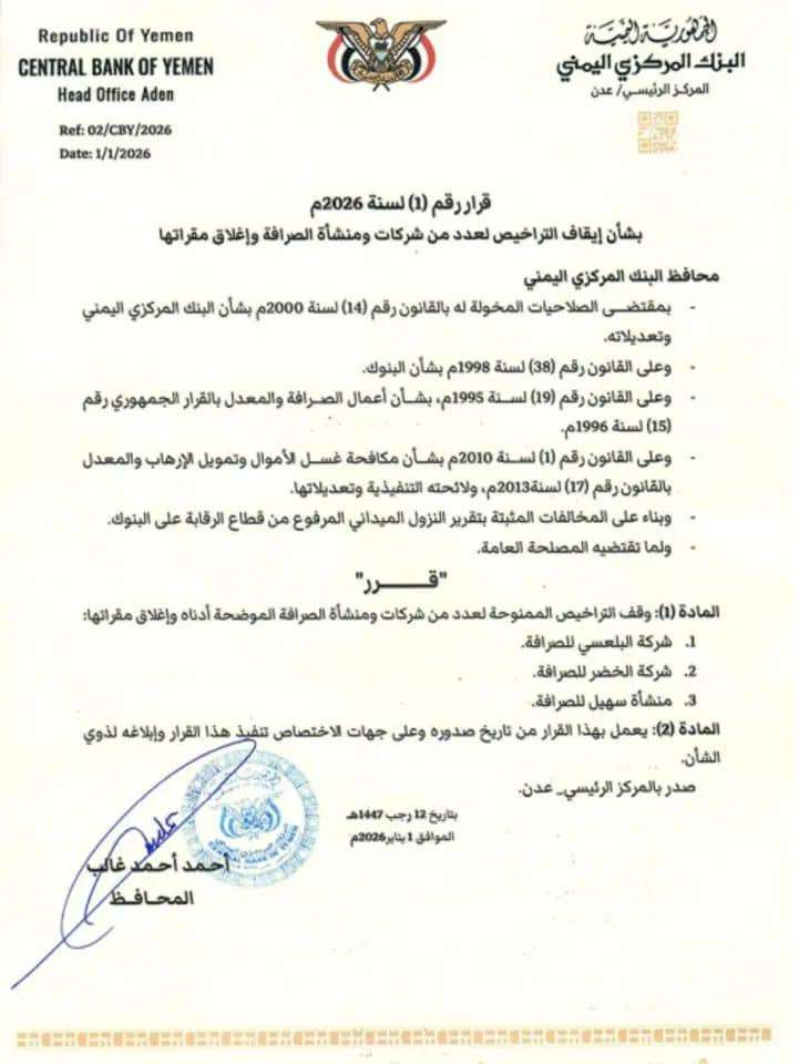 صوت عدن/ اعلام البنك: أصدر محافظ البنك المركزي اليمني بالعاصمة المؤقتة عدن الأستاذ أحمد أحمد غالب اليوم الخميس القرار رقم (1) لعام 2026 والذي قضى بإيقاف تراخيص عدد من شركات ومنشآت الصرافة في العاصمة ...
