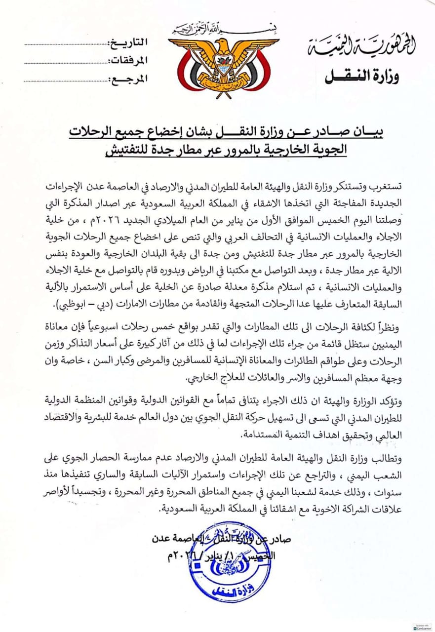 صوت عدن/ خاص :تستغرب وتستنكر وزارة النقل والهيئة العامة للطيران المدني والأرصاد في العاصمة عدن، الإجراءات الجديدة المفاجئة التي اتخذها الأشقاء في المملكة العربية السعوية عبر إصدار المذكرة التي وصلتنا ...