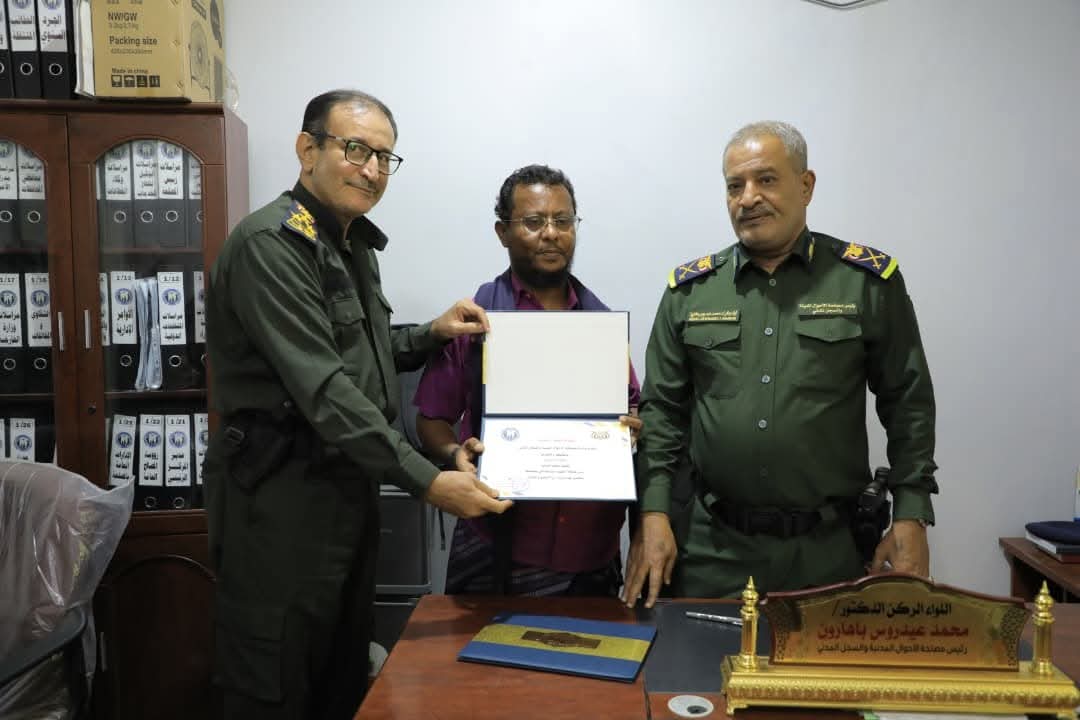 صوت عدن / إعلام المصلحة:كرمت رئاسة مصلحة الأحوال المدنية والسجل المدني، ممثلة برئيس المصلحة اللواء الدكتور محمد باهارون ووكيل المصلحة العميد محسن العمري، قائد نقطة مصنع الحديد التابعة للحزام الأمني ب ...