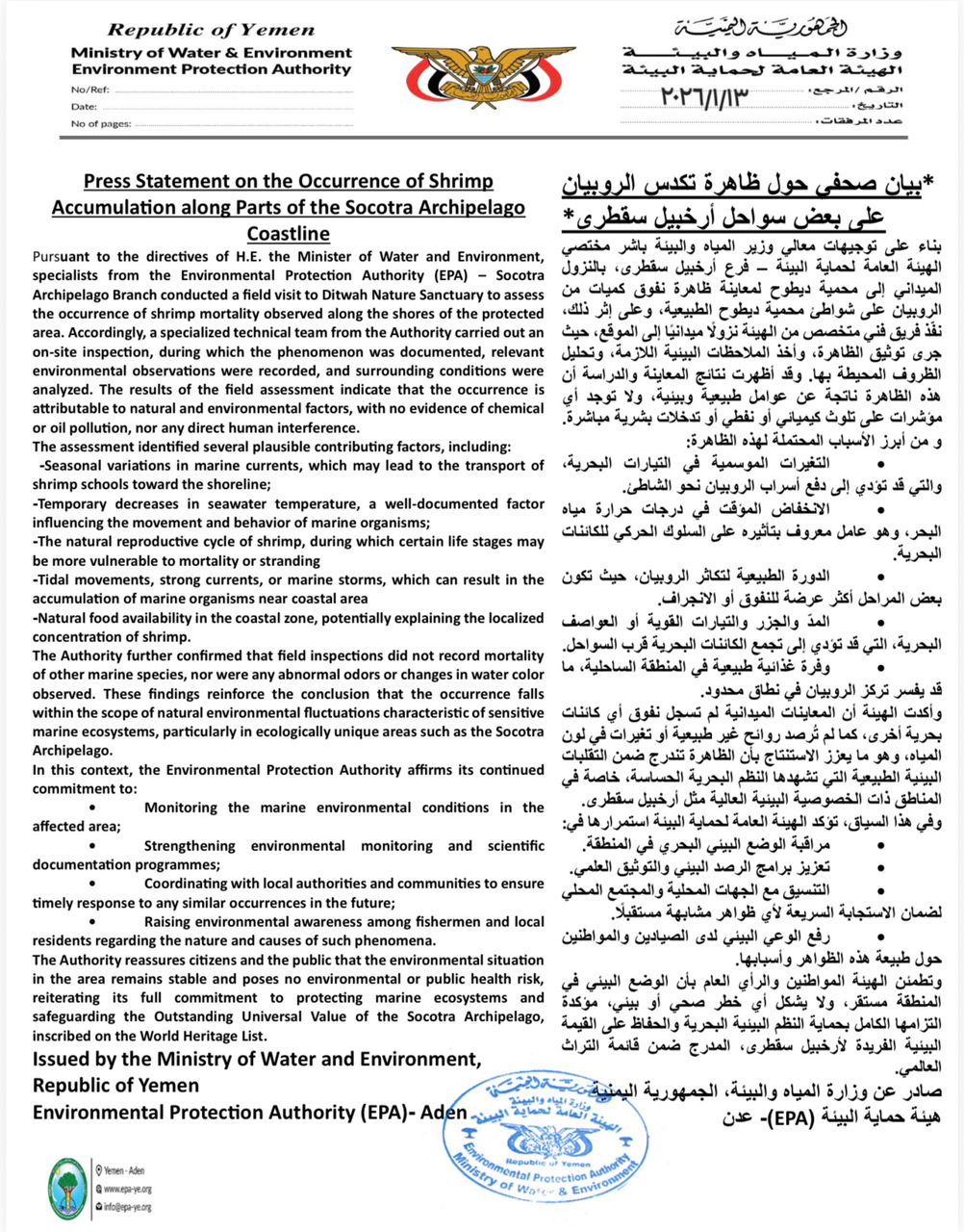 صوت عدن/وحدة التوعية والاعلام: بناء على توجيهات معالي وزير المياه والبيئة باشر مختصي الهيئة العامة لحماية البيئة – فرع أرخبيل سقطرى بالنزول الميداني إلى محمية ديطوح لمعاينة ظاهرة نفوق كميات من الروب ...