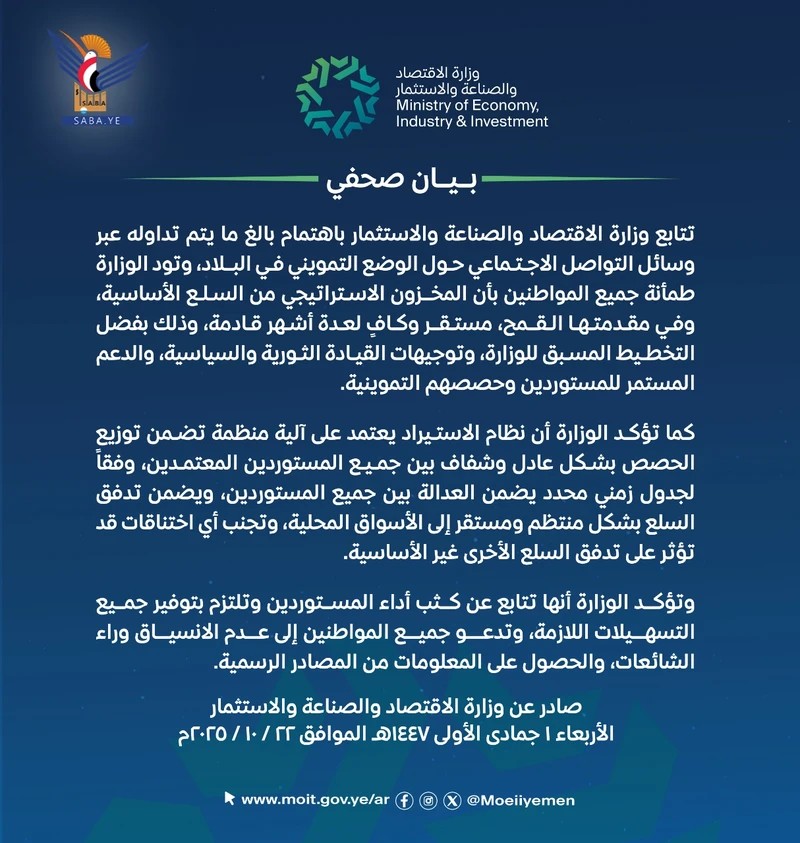 صوت عدن/صنعاء/سبأنت: أكدت وزارة الاقتصاد والصناعة والاستثمار بصنعاء أن المخزون الاستراتيجي من السلع الأساسية وفي مقدمتها القمح، مستقر وكافٍ لعدة أشهر قادمة.وطمأنت وزارة الاقتصاد في بيان تلقت وكالة الأ ...