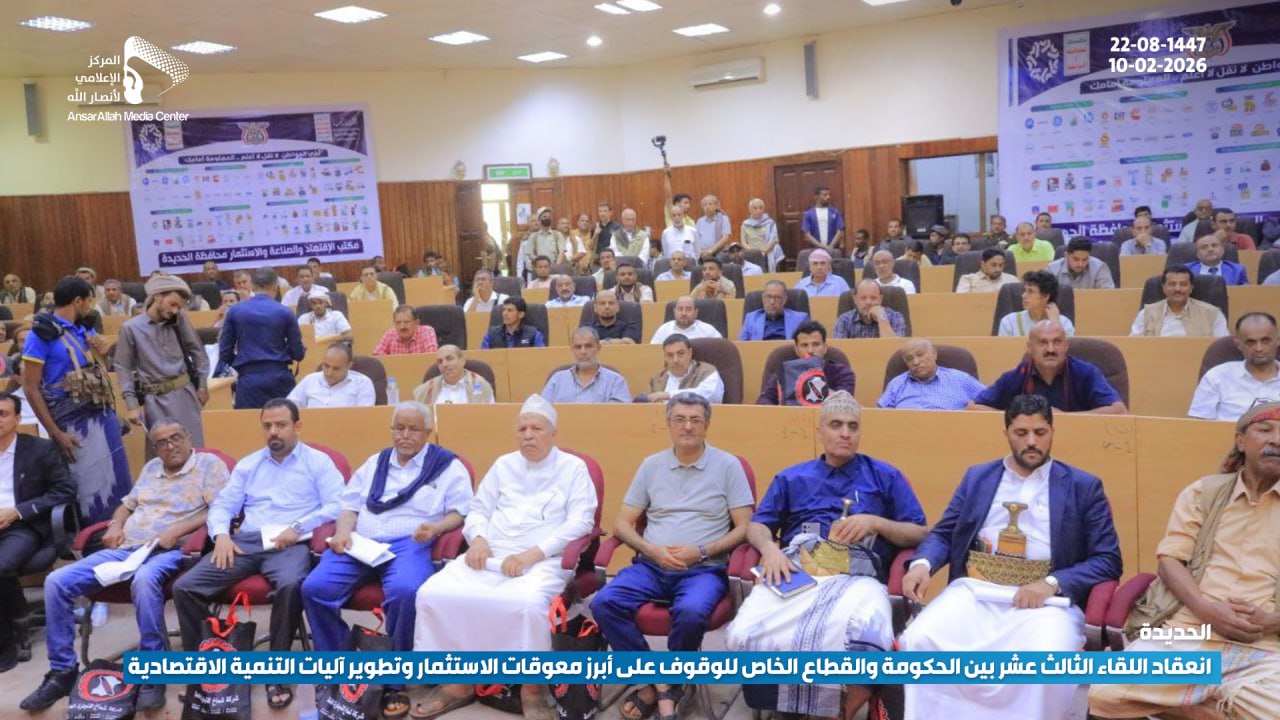 صوت عدن/الحديدة/المسيرة نت: عُقد اليوم في محافظة الحديدة اللقاء الـ13 بين الحكومة والقطاع الخاص لمناقشة أبرز معوقات الاستثمار وسبل تطوير آليات التنمية الاقتصادية وذلك في إطار توجهات رسمية تهدف إلى تعز ...