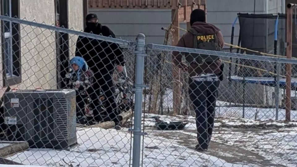 🔸يقف عناصر إدارة الهجرة والجمارك بجانب صبي، عرّفه أحد الشهود بأنه ليام كونيخو راموس، وهو طفل يبلغ من العمر خمس سنوات، قال مسؤولو المدرسة إنه تم احتجازه في مينيابوليس، مينيسوتا، الولايات المتحدة، في 20 يناير 2026. © رويترز