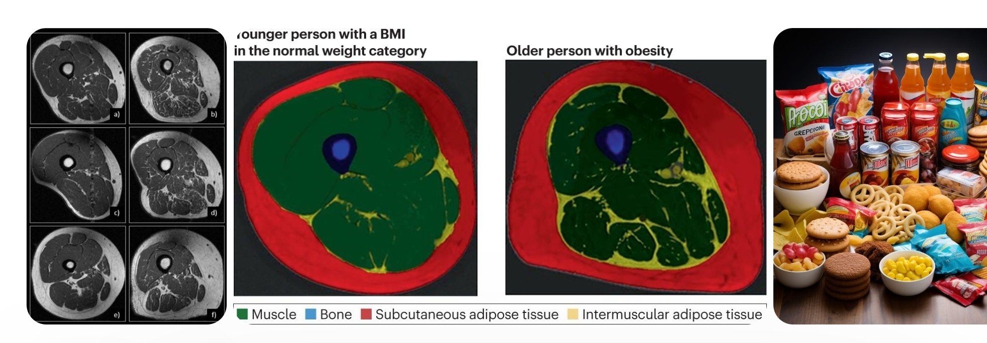 ونشر الأطباء صورة لمقطع عرضي لفخذ امرأة كانت تتلقى 87% من تغذيتها من الأطعمة فائقة المعالجة، مثل حبوب الإفطار السكرية، وألواح الشوكولاتة، والمشروبات الغازية. ورغم ممارستها نشاطا بدنيا معتدلا، ظهرت عضلات فخذها مليئة بالدهون المخططة الشبيهة باللحم المدهون.